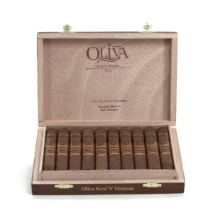 The Oliva Serie V Melanio Petit Corona No. 4 delivers complex flavours of wood, leather, coffee, and buttery toast, with a sweet caramel finish in a slow-burning smoke.